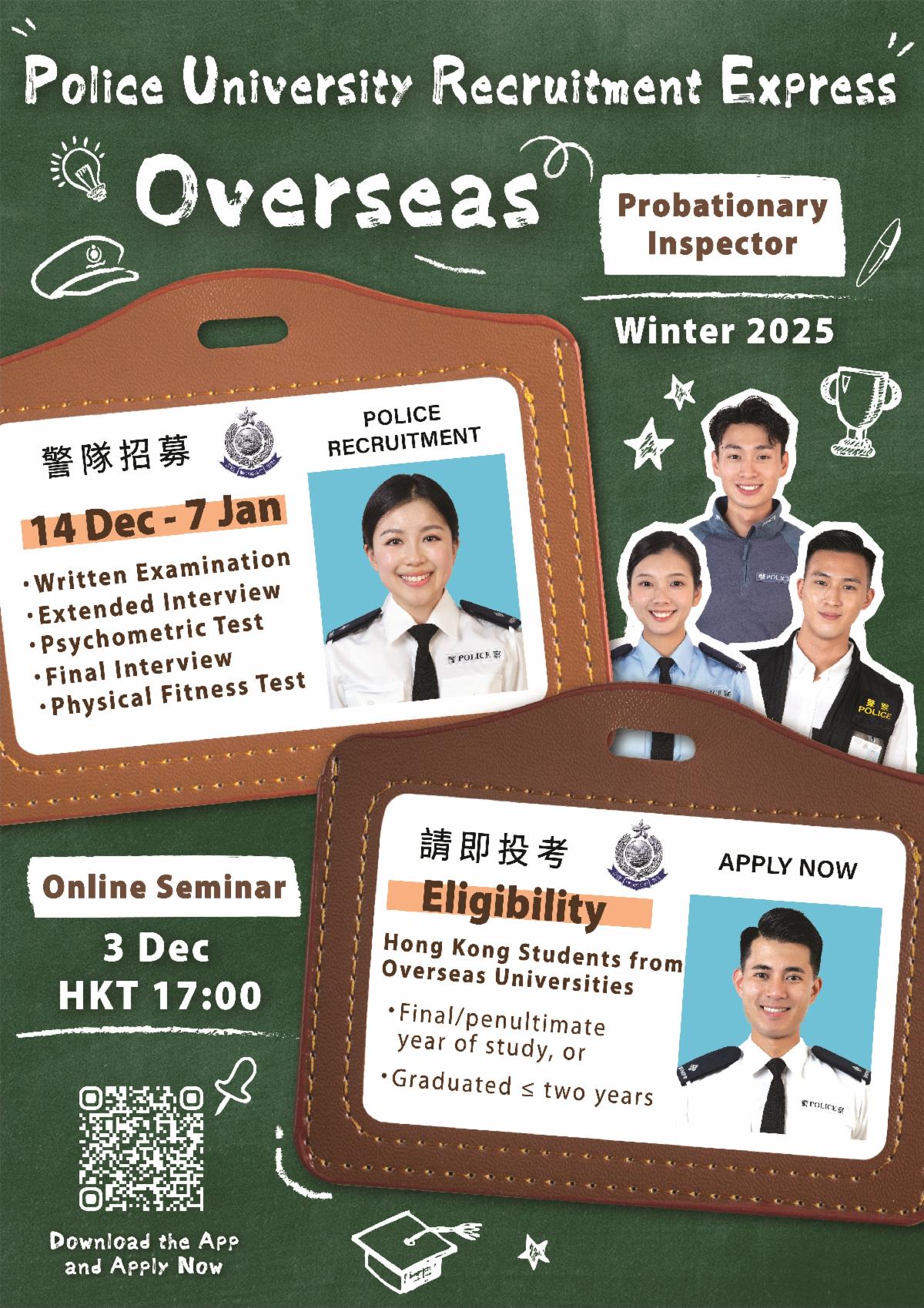 | Hong Kong Police launches overseas recruitment drive | The Hong Kong Police Recruitment Division will launch the Police University Recruitment Express – Overseas (PURE Overseas) during the winter holidays (Dec 2025 – Jan 2026) for Hong Kong students studying abroad. This initiative features a one-month Probationary Inspector selection and a two-week Police Constable selection process, both held in Hong Kong between Dec 14, 2025 and Jan 7, 2026. Hong Kong permanent residents studying at overseas universities in their final or penultimate year (graduates of 2025 and 2026), or graduates within the past two years, are welcome to apply. More information can be found here. | | ADMINISTRATION AND CIVIC AFFAIRS | | US politicians’ remarks opposed | The Hong Kong Special Administrative Region (HKSAR) Government strongly opposed (Oct 26) recent remarks by members of the US Senate Committee on Foreign Relations regarding the national security case involving Lai Chee-ying. It stressed that ongoing legal proceedings must not be interfered with, and external commentary attempting to influence the judiciary could constitute perverting the course of justice. The HKSAR Government stressed that all persons-in-custody are provided a secure, safe and humane environment, with access to health and medical care when needed. The HKSAR Government reiterated it will resolutely safeguard national security while upholding resident’s rights and freedoms under the law. | |
