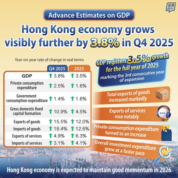 | Hong Kong economy grows by 3.5% in 2025 | Hong Kong economy grew visibly further in 2025, with real GDP grew by a robust 3.5%, an acceleration from the 2.6% growth in 2024 and marking the third consecutive year of expansion. In the fourth quarter of 2025, real GDP expanded by 3.8% year-on-year, up from the 3.7% growth in the preceding quarter. Growth was driven by a marked increase in total exports of goods, propelled by strong demand for electronic-related products and buoyant regional trade flows in Asia. Exports of services rose notably, supported by sustained growth in inbound tourism as well as vibrant cross-boundary financial service activities. Looking ahead to 2026, Hong Kong’s economy is expected to maintain good momentum in 2026, supported by moderate global growth, strong demand for artificial intelligence-enabled electronic-related products, potential US interest rate cuts and government measures to develop the economy and diversify markets. | | Financial Secretary's visit continued in Davos | Financial Secretary Paul Chan promoted Hong Kong’s strategic strengths in finance, trade, and innovation, during his attendance at the World Economic Forum (WEF) Annual Meeting, Jan 19-23, in Davos, Switzerland, underscoring the city’s role as an international financial centre and gateway to China’s high-quality, innovation-driven economy. Speaking at the “How to Finance Decarbonization?” session (Jan 22), he outlined Hong Kong’s 2050 carbon neutrality target, emphasising green finance initiatives like tokenised green bonds, sustainable infrastructure investment, and incentives for electric vehicles and green buildings. | | |