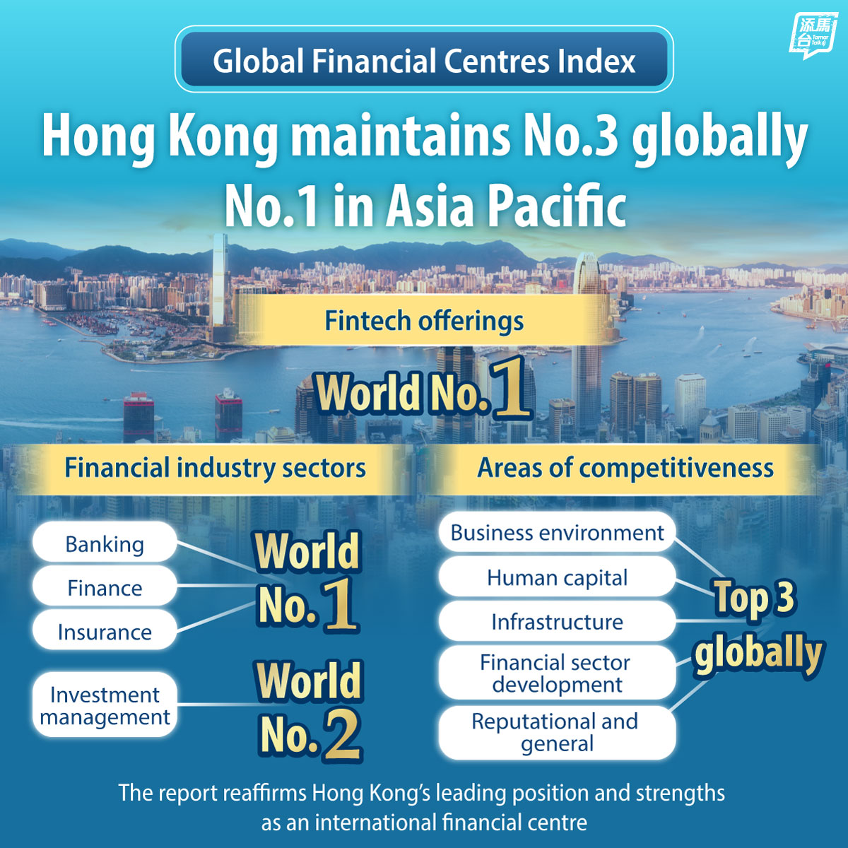 | Hong Kong seals top global finance hub status | Hong Kong has maintained third place globally and first in Asia-Pacific in the Global Financial Centres Index 39 Report, published on March 26, with its overall rating rising one point to 765, just two points behind first place, New York, and one point behind second place, London, respectively. Hong Kong topped global rankings in fintech, insurance, banking and finance sectors while climbing to second in investment management. The city’s rankings in the five areas of competitiveness, namely business environment, human capital, infrastructure, financial sector development, and reputational and general, continued to stay among the global top three positions. The Hong Kong Special Administrative Region (HKSAR) Government said the report reaffirms Hong Kong’s leading international financial centre, adding that it will continue to advance “Finance+”, enhance market competitiveness, and align with the National 15th Five-Year Plan to drive high-quality financial development. | | Wealth summit underscores Hong Kong’s global family office role | The fourth Wealth for Good in Hong Kong (WGHK) Summit (March 24) brought together over 400 global family office decision-makers and industry leaders to discuss multi-generational wealth management, innovation and philanthropy. Chief Executive John Lee said Hong Kong remains a stable and resilient city for capital, institutions and families amid global uncertainty. Financial Secretary Paul Chan said Hong Kong is a safe harbour and gateway to Chinese Mainland opportunities, while Deputy Financial Secretary Michael Wong highlighted the city’s stability, policy predictability, and trusted institutions, underpinned by its “one country, two systems” framework. Secretary for Financial Services and the Treasury Christopher Hui described Hong Kong as “safe, stable and sophisticated”, noting the Impact Link (iLink) initiative under the Hong Kong Academy for Wealth Legacy has organised 17 workshops for over 700 participants and connected 55 partners supporting 12 projects. | |